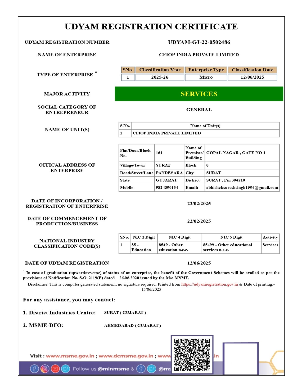 Udhyam Registration Certificate of CFIOP India Private Limited