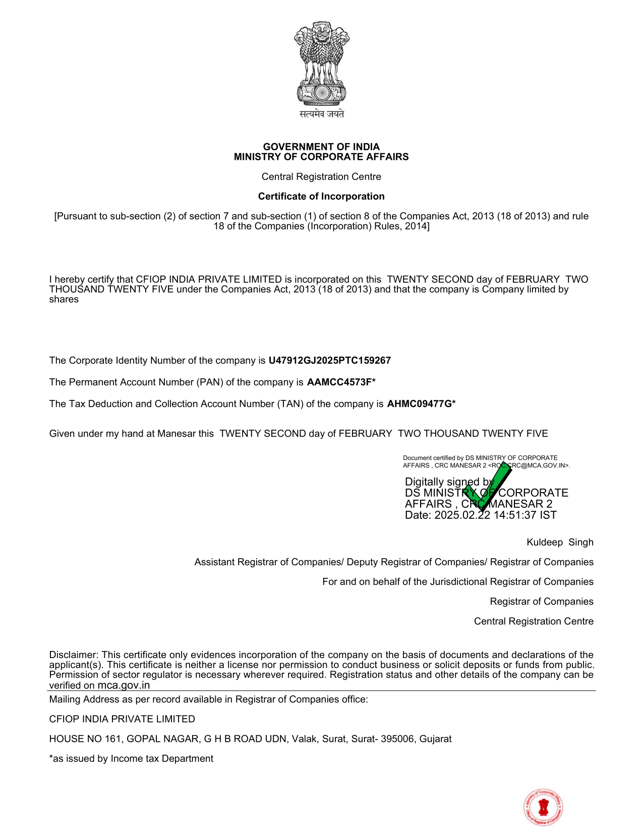 Certificate of Incorporation of CFIOP India Private Limited